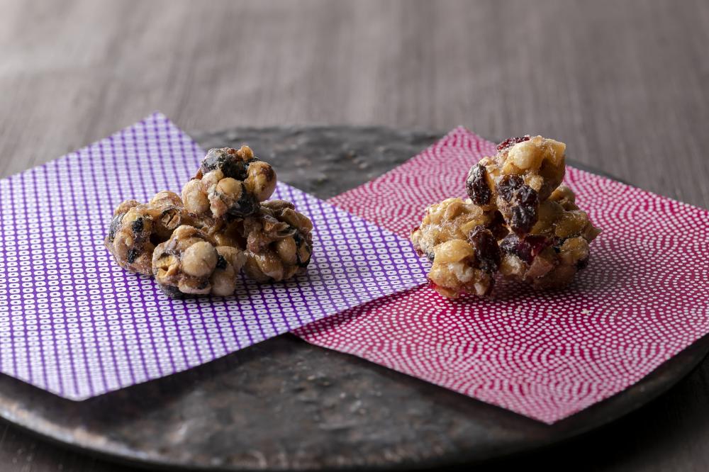 「黒豆クランチ」は、そんな黒豆を手軽に食べられる豆菓子です。熊本県産を中心に九州産を選んだ黒豆に、国産の小豆や大豆、ピーナッツ、くるみを合わせ、蜜でコーティング。デスクワーク中にも片手で食べやすいブロックタイプに仕上げました。豆やナッツの香ばしさが、コーヒーや紅茶によく合います。